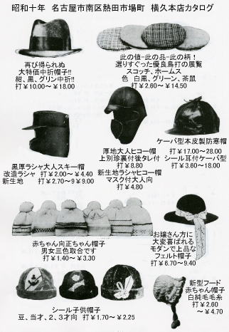 | 昭和3年 ブラザーミシン第1号機「昭三式 カン縫いミシン」誕生 昭和7年 満州国独立 昭和12年 名古屋汎太平洋平和博覧会開催 昭和13年 昭和15年 昭和16年 太平洋戦争突入 帽子の価格統制令が発令された |