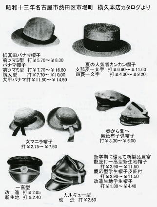 国産の安価で丈夫なミシンの誕生で帽子の製造がますます盛んに なった。 輸出や通信販売が盛んに行われるようになった。 昭和13年の主な輸出先と金額(名古屋市勧業要覧より) 満州 58,814円 朝鮮 35,534円 樺太 32,000円 台湾 24,895円 アフリカ 3,050円 帽子業界から多数出品があった。 戦闘帽が主体となってきた。 街中では戦闘帽、国民帽、鉄兜、防空頭巾が主体となった。 生活物資が不足して物価が急騰した。 小売値 シルクハット 1個 40円 ファー中折 1個 20円 本パナマ 1個 20円 麦稈帽子 1個 4円60銭 鳥打帽子 1個 6円50銭 大学生用帽子 1個 8円50銭 小学生用帽子 1個 3円 など |