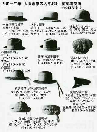 熊澤又助、飯田萬次郎が共同で官制帽を作り始めた。 後藤與四兵衛が軍帽、トルコ帽、防寒帽を作り始めた。 東京の島田重郎兵衛により日本最初の麦稈帽子が作られた。 愛知県に普及。熱田を中心に麦稈帽子の製造が始まった。 経木帽子の生産始まる。 愛知県麦稈真田同業組合設立 粗製乱造の結果輸出がストップした。 パナマ帽流行 この頃はやった帽子 山高、中折、鳥打、学生帽、大黒型、 鍔狭(カンカン帽)、鍔大(麦稈帽子)、 パナマ型、猪口型、レース型 「衣服と流行」より 愛知県麦稈真田紐営業組合設立 業界の指導監督を行うため設立された。 ドイツよりカン縫いミシンが導入され機械化が始まった。 |
